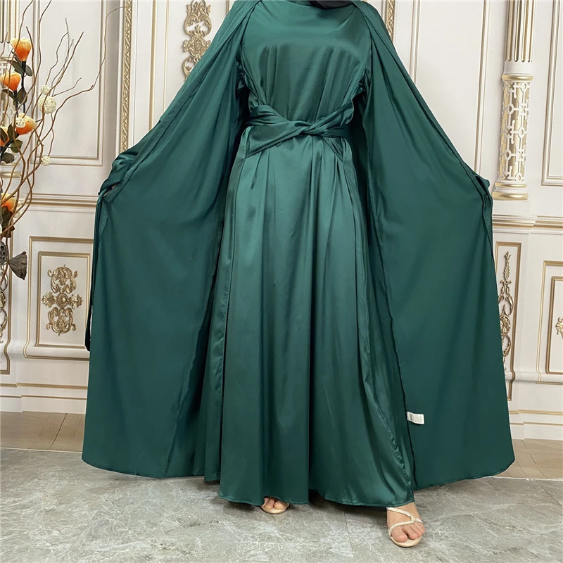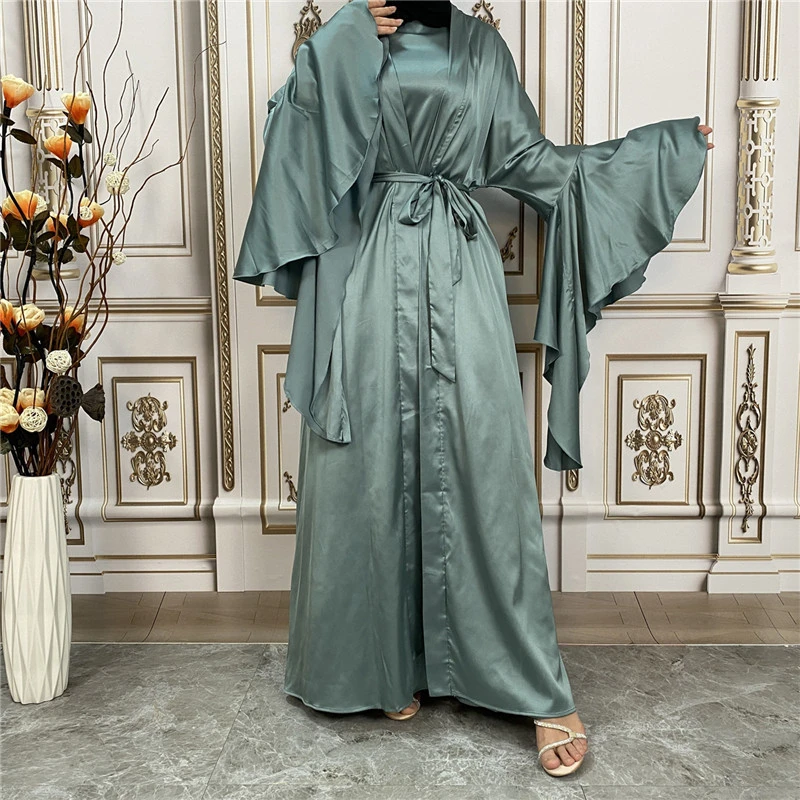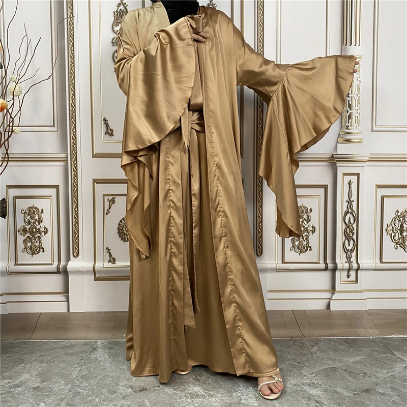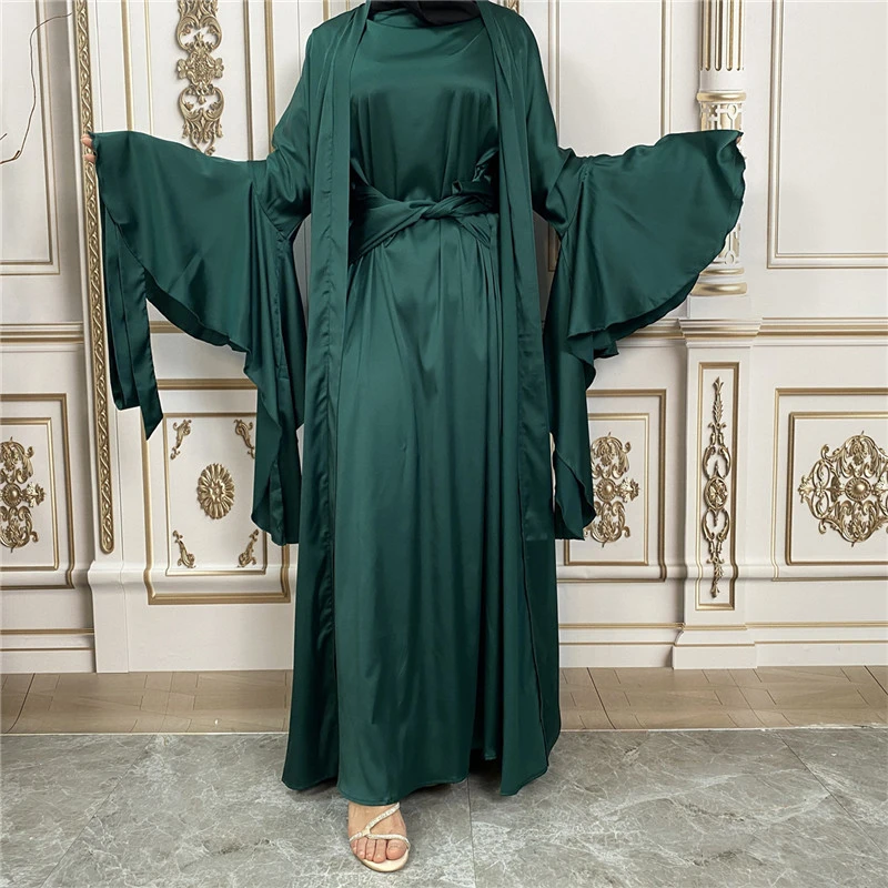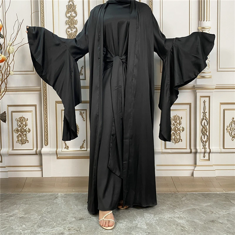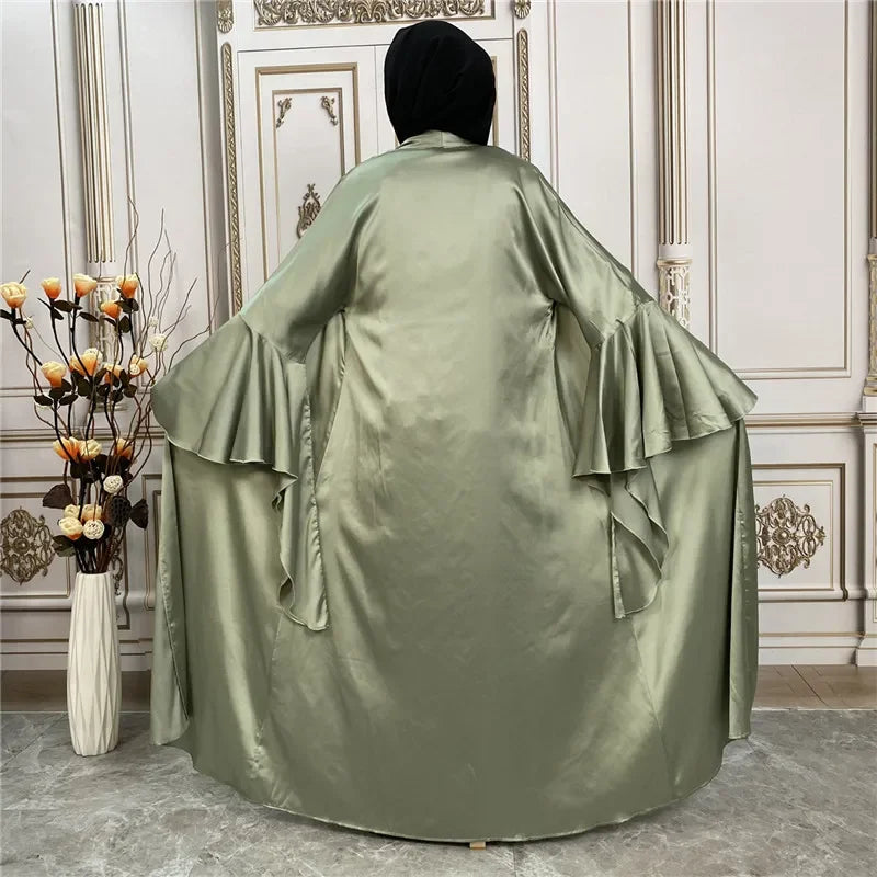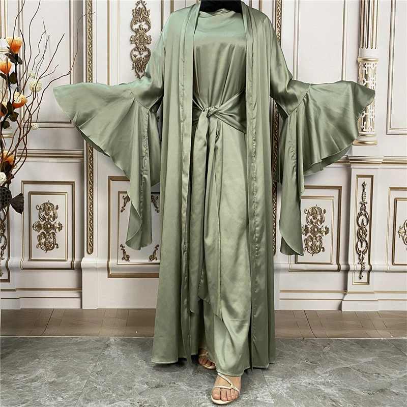 Shiny Satin Kimono Muslim Open Abayas for Women Dubai 2 Piece Set Dress Turkey Ramadan Kaftan Clothing Islamic Outfits Arab Gown