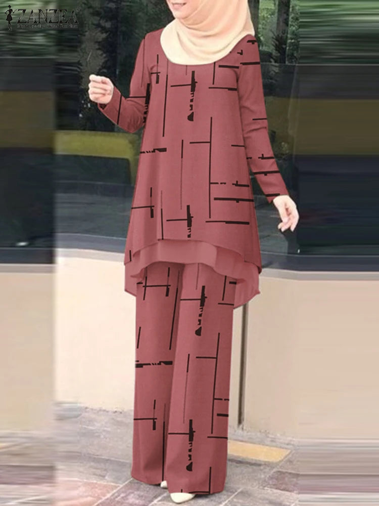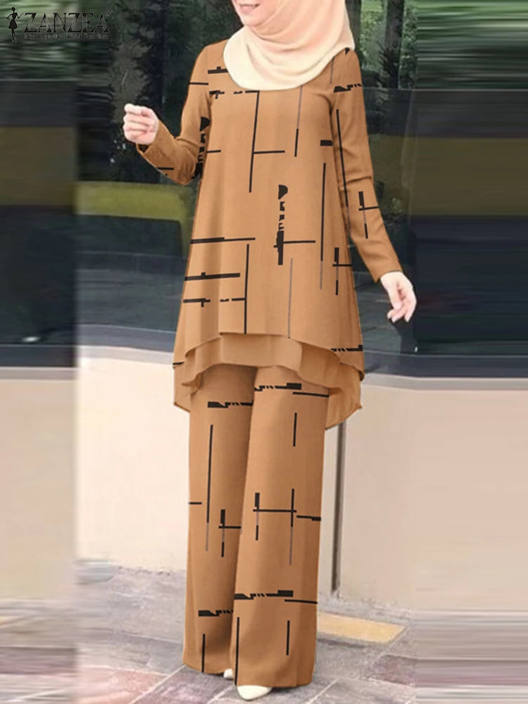 ZANZEA Muslim Women Pant Sets Islamic All-over Printed Long Top and Wide Leg Pant 2pcs Outfits Vintage Elegant 2-Pieces Suits